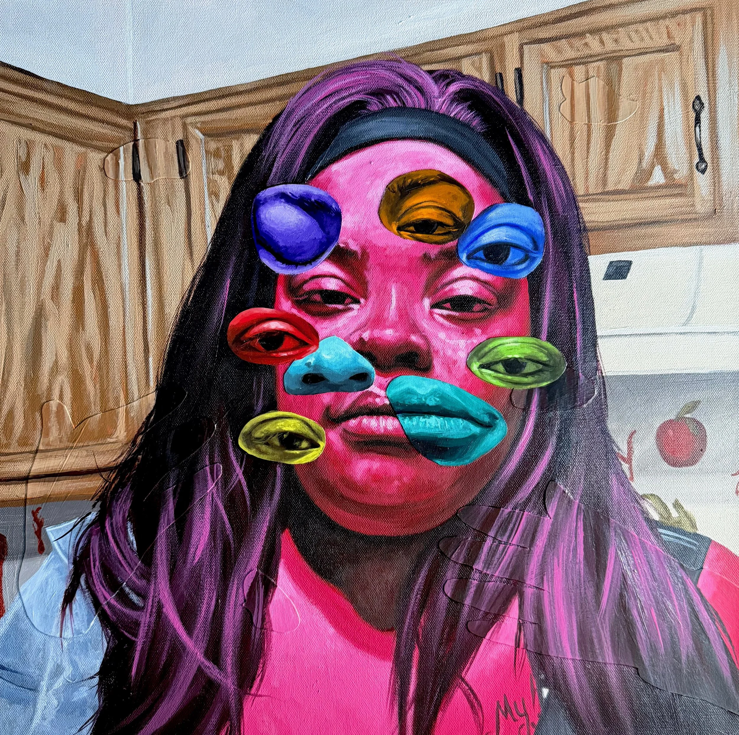 LaNia’s portraits consider family, Black identity, and the South as sites of contradictory experience and intricate nuance. Her practice draws deep from art history, particularly Fauvist color and Cubist forms, to render the multiplicity of her subjects simultaneously. Her layered paintings celebrate Black identity and challenge one-dimensional presentations of Black Southern culture. Each image replicates body parts (eyes, noses, arms, and legs) as if the figure is in a blur of motion. The bright, highly saturated color adds to the otherworldly effect of the paintings, depicting the figures doing everyday tasks in a vivid kaleidoscope of movement. To develop these works, LaNia first photographs her subjects repeatedly, from many angles, and the resulting collaged paintings combine acrylic on canvas with watercolor paper. The addition of watercolor paper adds a multidimensional aspect to the work that echoes the multifaceted perspective of the figures. In these works, LaNia positions her great-grandmother’s kitchen as the setting for life's moments, big and small, to be centered and celebrated as the fabric of a family.